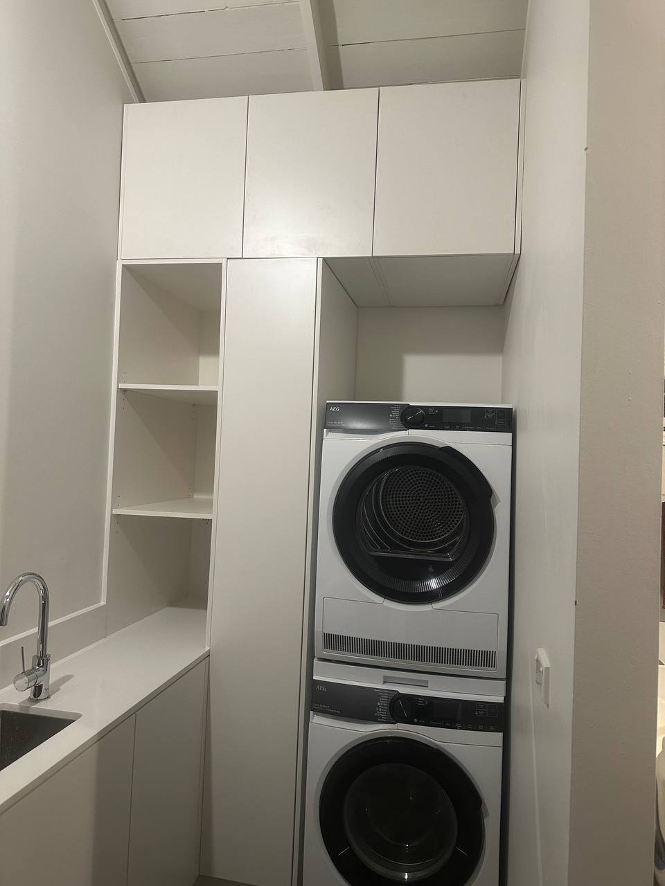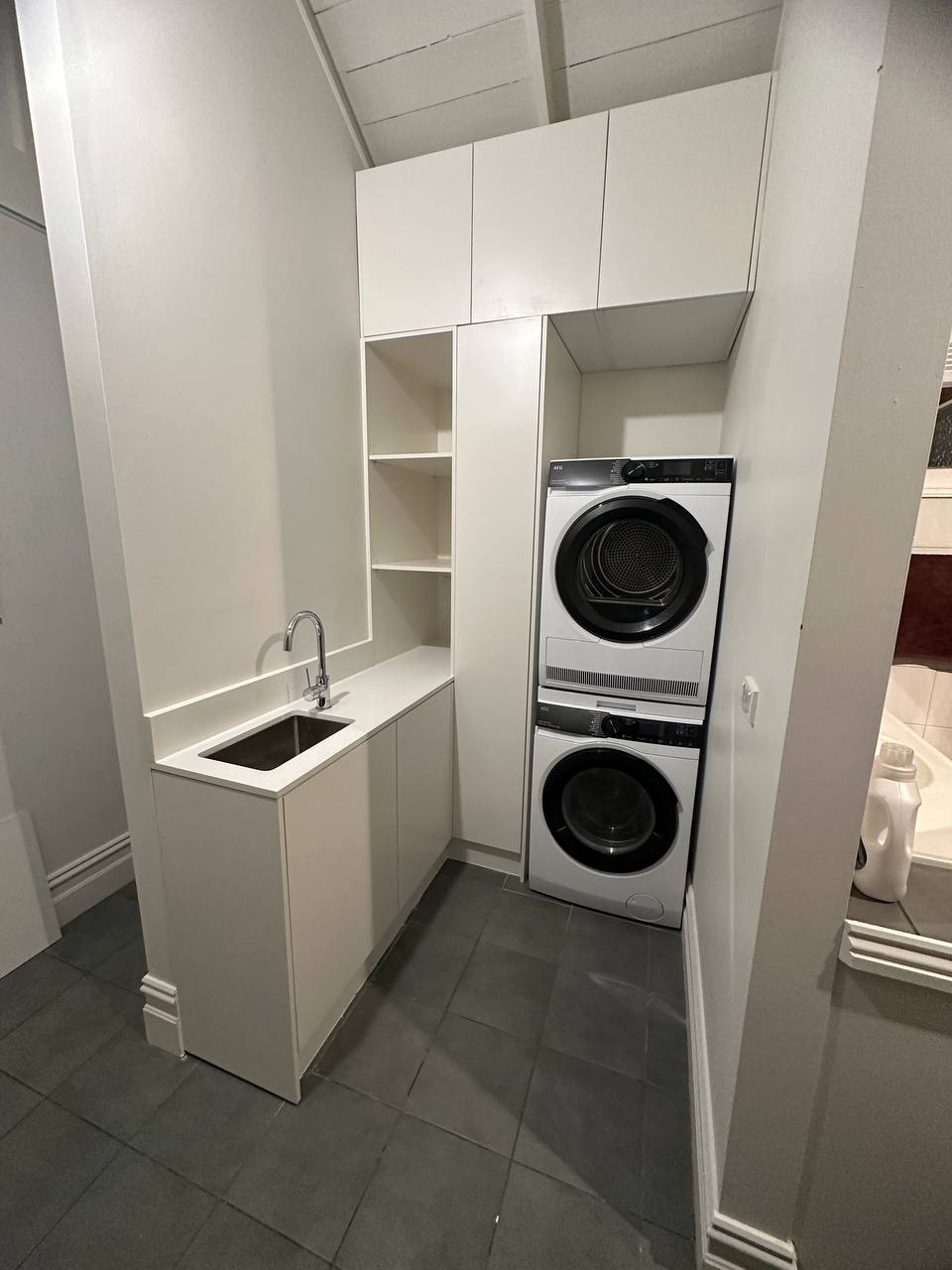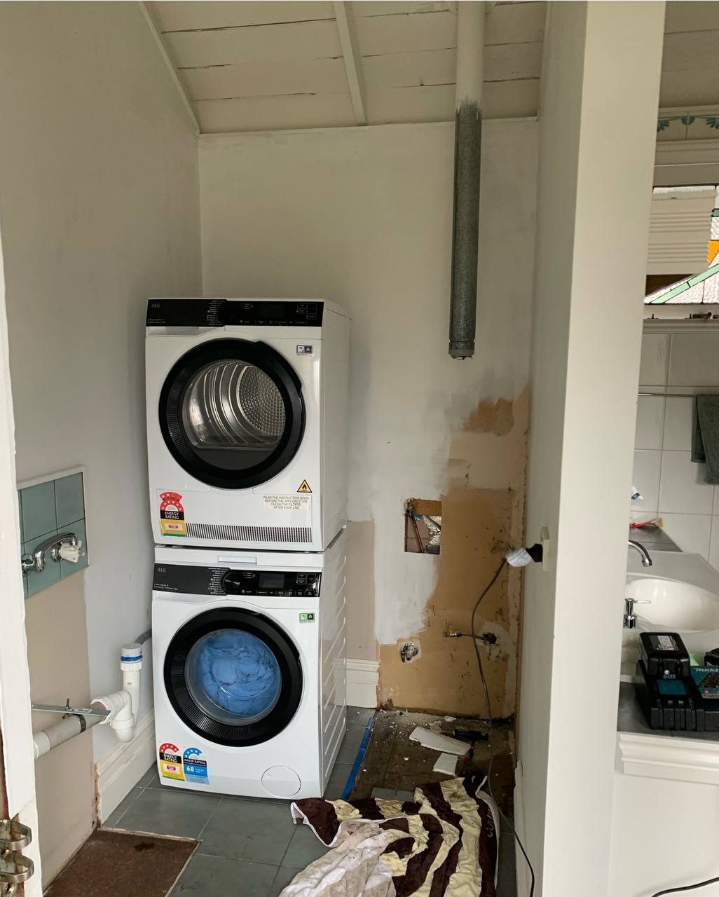 Laundry renovation Steps: 1:diminished existing plasterboard 2:Frame reinforcement 3:tiling 4:cabinet Measuring 5:Installed cupboards